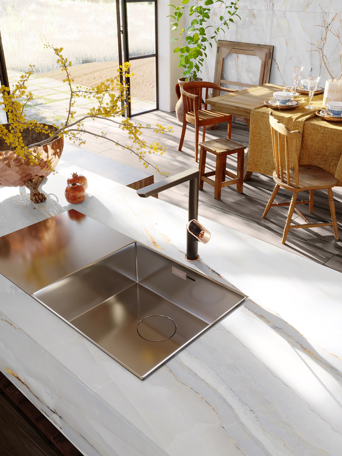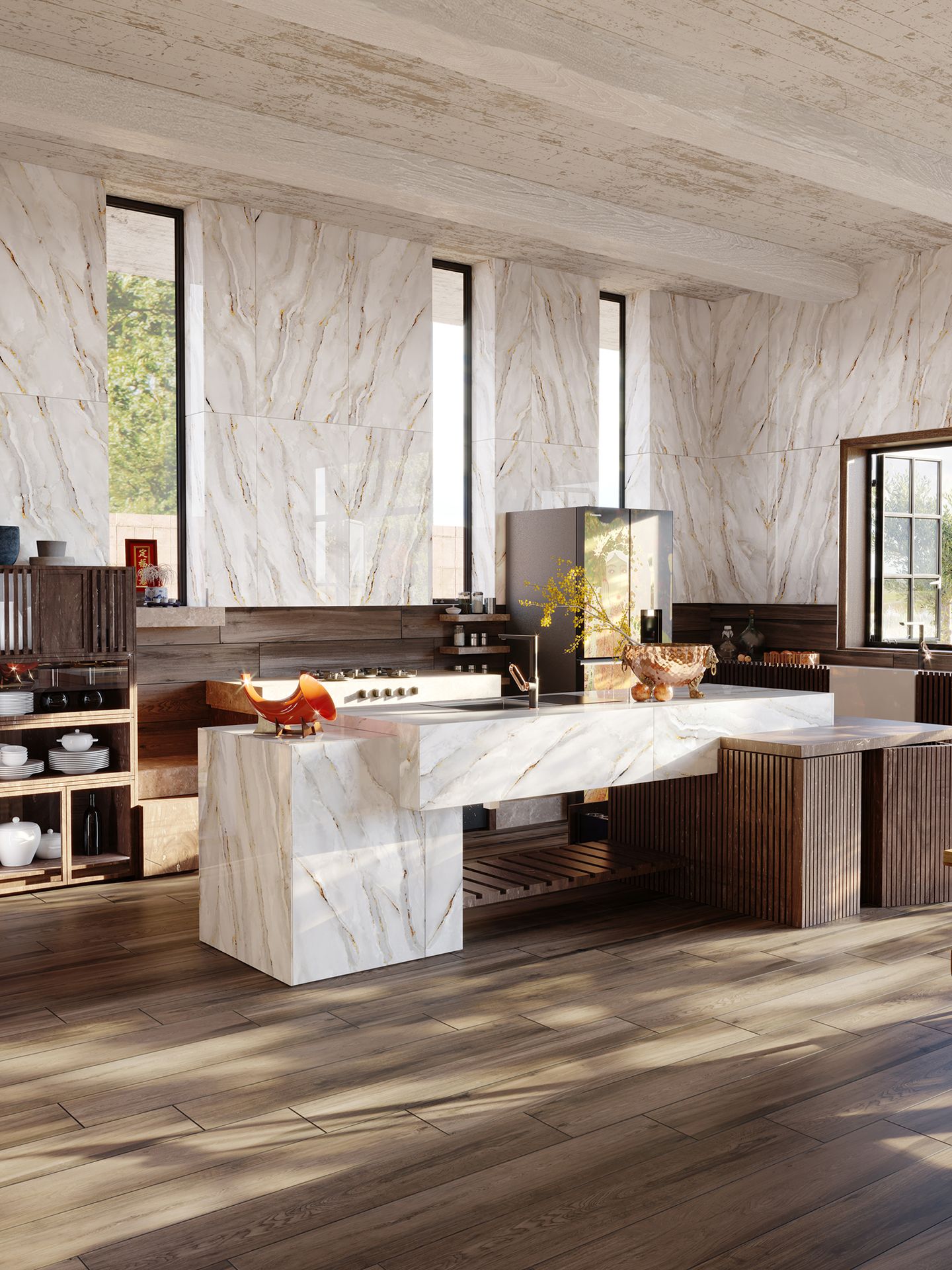 - Plans de travail en quartz, granit, bois massif ou céramique, qui allient robustesse et élégance.